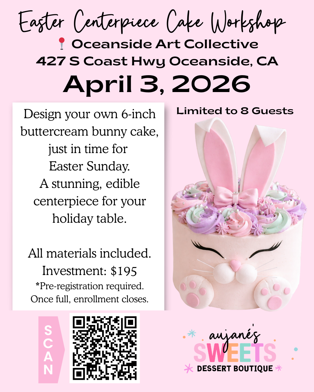In this hands-on workshop, you’ll decorate your own 6-inch buttercream bunny cake — complete with pastel rosettes, fondant ears, bow, and paw details — designed to double as a stunning centerpiece for your Easter table.