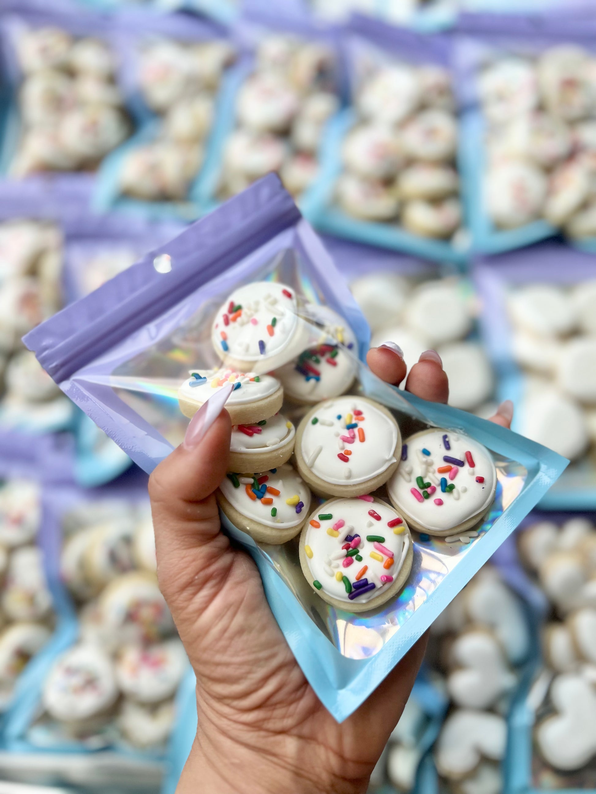 Aujané's sugar cookies are made from scratch and decorated by hand. The cookie dough features real butter, fresh eggs, and almond flavor. The slightly crunchy, sweet, and buttery dough is accompanied by royal icing. Royal icing is a pure white icing that dries to a smooth, hard, matte finish.